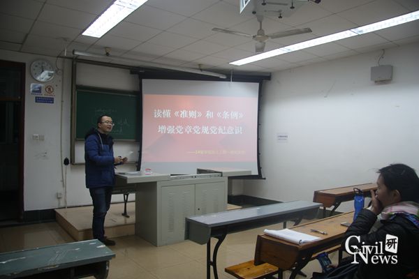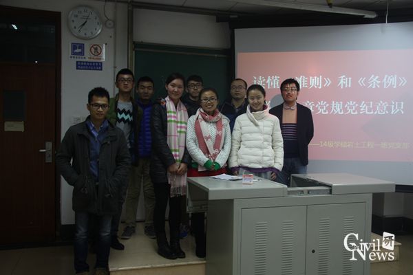 为了使全体党员深入学习新版《准则》、《条例》,12月14日晚7时,14级学硕岩土一班党支部在逸夫馆4304B举办了一次主题为“读懂《准则》、《条例》”的支部活动。