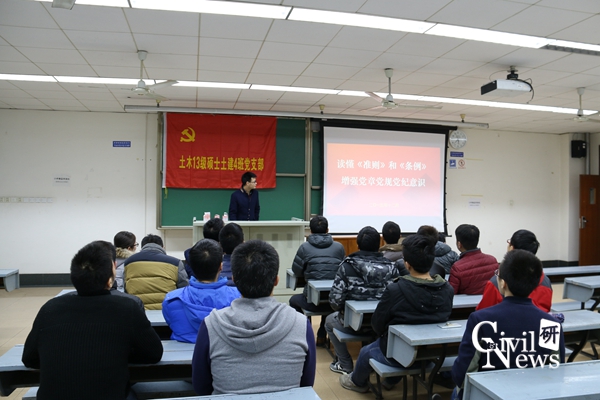 12月18日下午5:30在逸夫楼4407B教室,2013级硕士土建四班党支部开展了“讲党性、守党规、严党纪”学习民主生活会,会议主要对大家近期学习“准则”和“条例”的心得体会进行了总结,各位党员同志就学习心得进行了分享交流,相互促进,加深学习感悟。土建四班党支部组织委员赵玉东为全支部党员及预备党员作了名为“重温党章,学习《准则》和《条例》,加强党员自身修养”专题报告,全面深入地为大家讲解了《准则》和《条例》对党员特别是党员干部的要求。