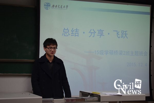 12月4号晚上7点半,2015级学硕桥梁二班在逸夫馆4322召开班风建设主题班会。主题班会由班长王康康主持,学硕桥梁二班全体同学参加了班会。班会共分为三项,首先是班委成员总结近半学期的工作及下学期规划,然后是班级成员分享自己的学习经历,最后班长王康康就关于近期出现的安全问题提醒大家注意防范。