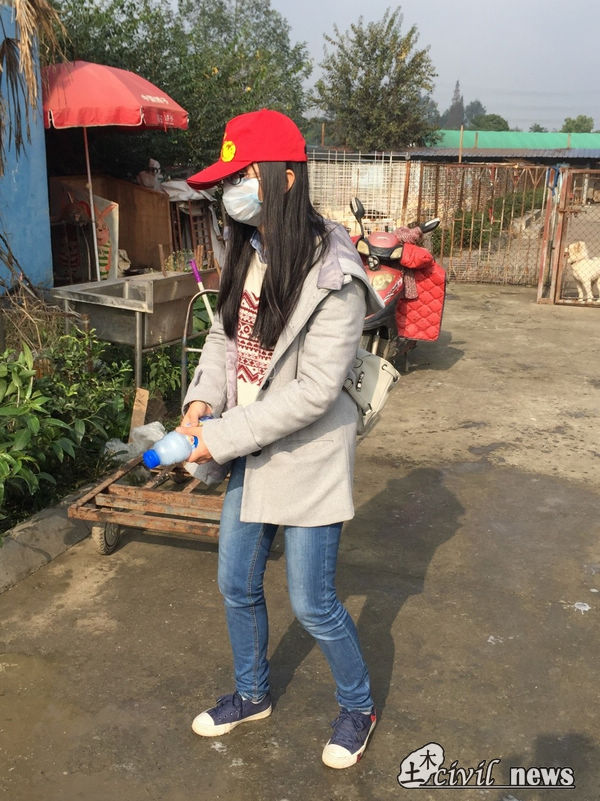 在清扫完狗舍之后,志愿者们用自制的“喷壶”,把带来的消毒液按比例调配好,对保护中心的通道进行了消毒。