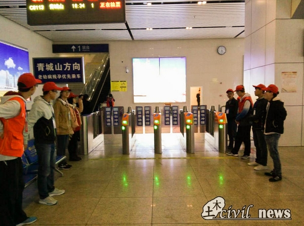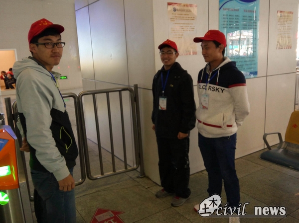 本次志愿者服务的第二部分,则是剩下的人进入高铁站维护进站和出站的秩序。志愿者们刚一进入高铁站,映入眼帘的便是拥挤的旅客。负责维护进站秩序的志愿者便在进站口处,帮助工作人员疏导旅客有序进入站台,主动上前搀扶行动不便的老人并帮助行李多的旅客搬运行李。高铁站的进站口也在土木青协志愿者的帮助下变得秩序井然。而负责维护出站口秩序的志愿者便进入站台,帮助站台的保安疏导旅客有序离开站台或进入犀浦地铁站换乘地铁。当时有部分旅客在检票机前检票时,由于操作不当而无法通过检票口,在公司土木青协志愿者的及时而热心的帮助下,很快通过了检票。此外,在旅客检票时,出站口的部分检票机突然出现故障无法检票,使得部分旅客一时无法出站,土木青协的志愿者便迅速上前向旅客们询问相关情况,在明白问题所在后,就立即向保安汇报,在保安和志愿者们的共同帮助下,旅客们很快便从一个临时的出站口有序离开,高铁站站台的秩序也因此而得到恢复。
