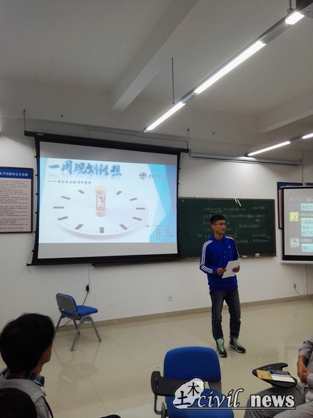 为了让大家平复燥热的内心,李书记放了一首纯音乐,让大家伴着优美的乐曲想象一幅美丽的画面——阳光,草地,慵懒的猫和天际下的自己。乐曲渐入尾声,大家的心情也变得平静。随后,李书记让大家分组展示任务成果,并用PPT向在场同学讲解自己的一周规划。