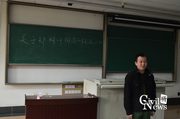 会议第一项,大家欢迎郑柯汗同学上台宣读转正申请书。他准备的很认真,谈了自己对党员的理解,以及为了成为一位合格的共产党员需要具备的素质,并表明了自己对于未来的打算,会更加认真地领悟党的精神,学习科学文化知识,如果转正申请成功,他一定会为还没有成为共产党员的同学做好榜样。