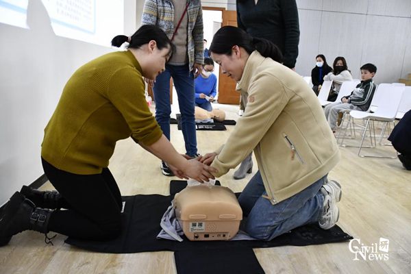 此外,谢医生还给我们介绍了海姆利克急救法,对于不同的人群,操作的手法也不尽相同,医护人员详细的给我们演示了青年、孕妇以及婴儿的海姆利克应对方法。之后,在座的教职工们在医护人员的指导下进行了心肺复苏的实践训练,更加深入的理解整个过程。