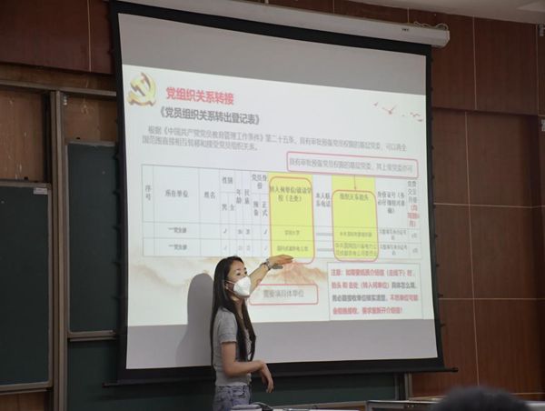 首先,熊老师以生动形象的语言,详细阐述了毕业生党员转接党组织关系的相关事宜,依次就党组织关系转至何处、党员组织关系具体转接步骤以及转接过程中需要注意的一些事项进行了说明,并提醒毕业生党员要重视党组织关系转接工作,做到及时沟通、及时反馈,确保高效完成组织关系转接事宜。同时,熊老师根据实际案例给与毕业生党员们诸多实用的建议。