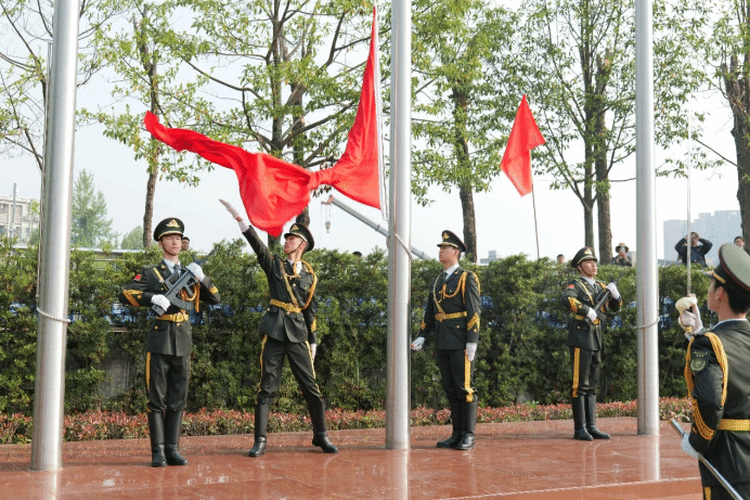 各单位方阵整齐列队,在庄严肃穆中,全体人员起立,面向冉冉升起的五星红旗,庄重行礼,奏唱国歌。