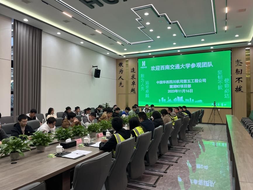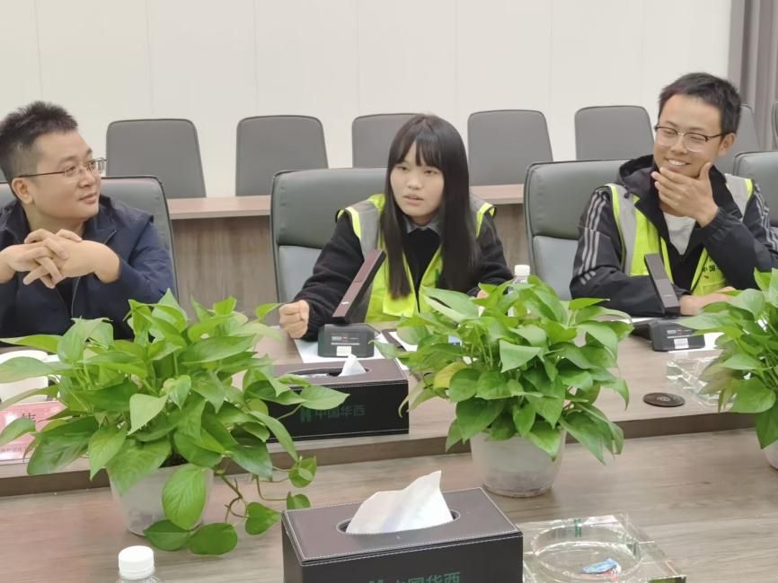 项目现场参观结束后,公司师生返回麓湖生态城C28项目部会议室进行座谈交流。项目负责人从中国华西四川机司公司宣传片、形象片入手,让同学们认识企业、了解企业,依托麓湖生态城C28项目情况及关键节点,让同学们更加深入了解了项目实际施工中的重点难点。此外,还特别邀请到了项目部2023年新员工及公司员工给同学们分享了入职以来的心得体会,在与同学们的交流讨论中,解答了同学们心中的疑惑。