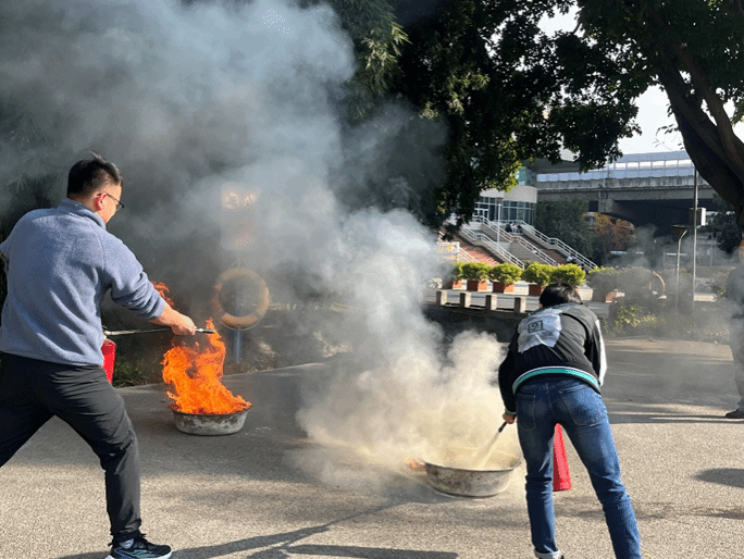 在实验室安全须知培训结束后,唐老师带领同学们前往户外场地开展灭火器的使用方法与实操培训。