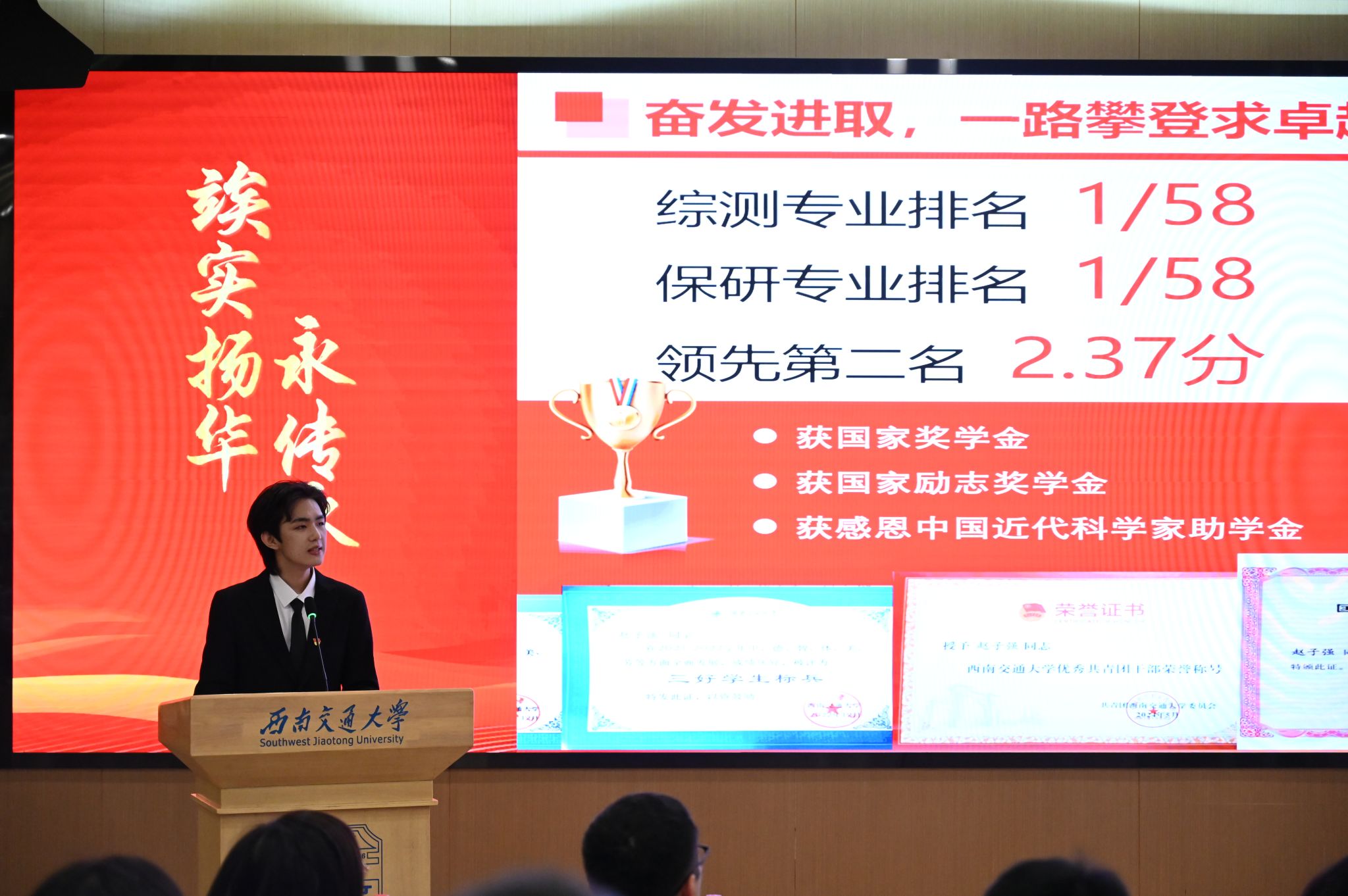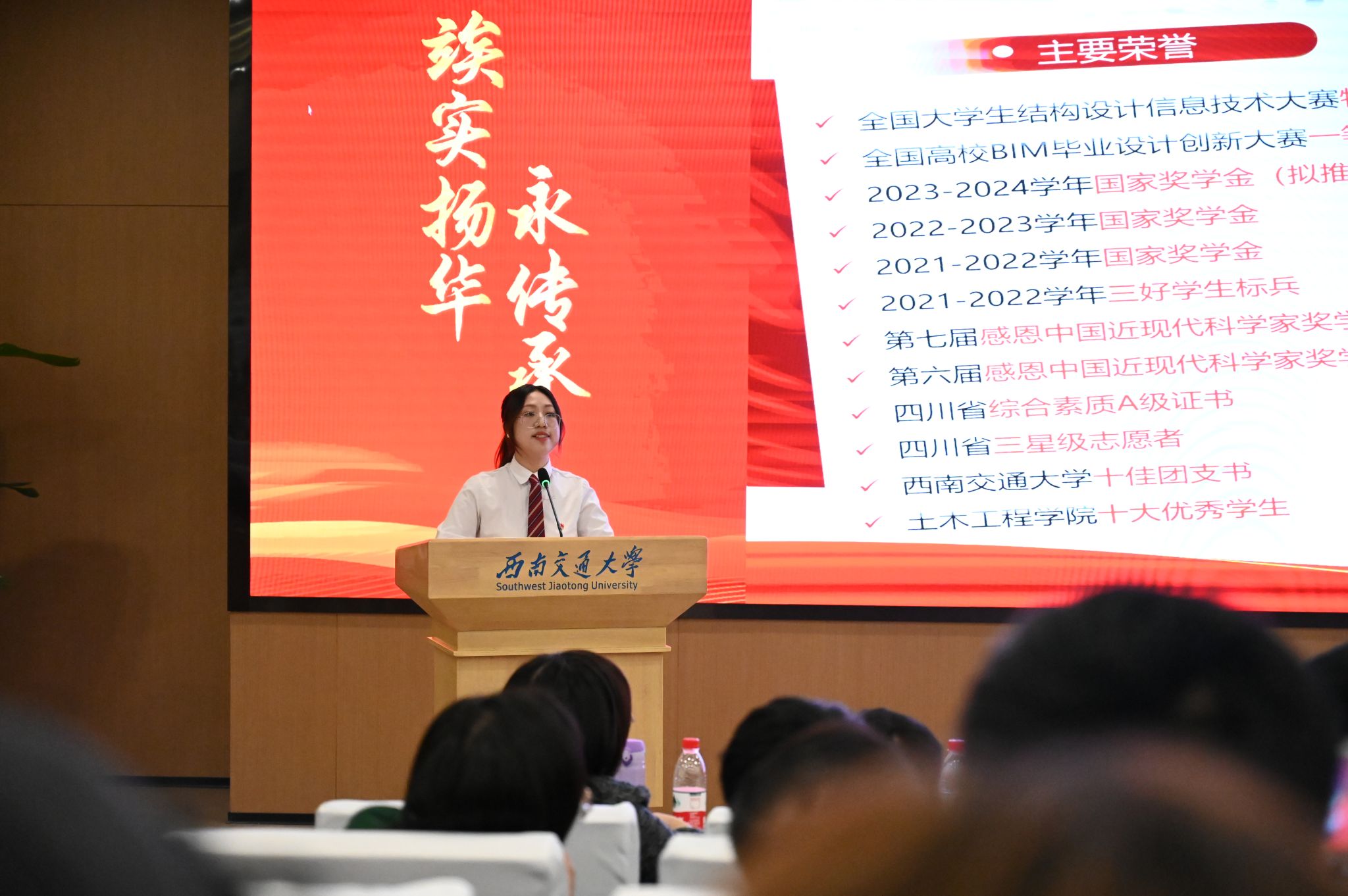 2024年11月18日下午14:00,“竢实扬华奖章”评选展示会在犀浦校区图书馆一号报告厅举行,bevictor伟德2021级本科生肖岚芝同学和赵子强同学作为候选人参与答辩。其中,肖岚芝同学成功当选为2024年“竢实扬华奖章”(本科生)拟推荐人选。
