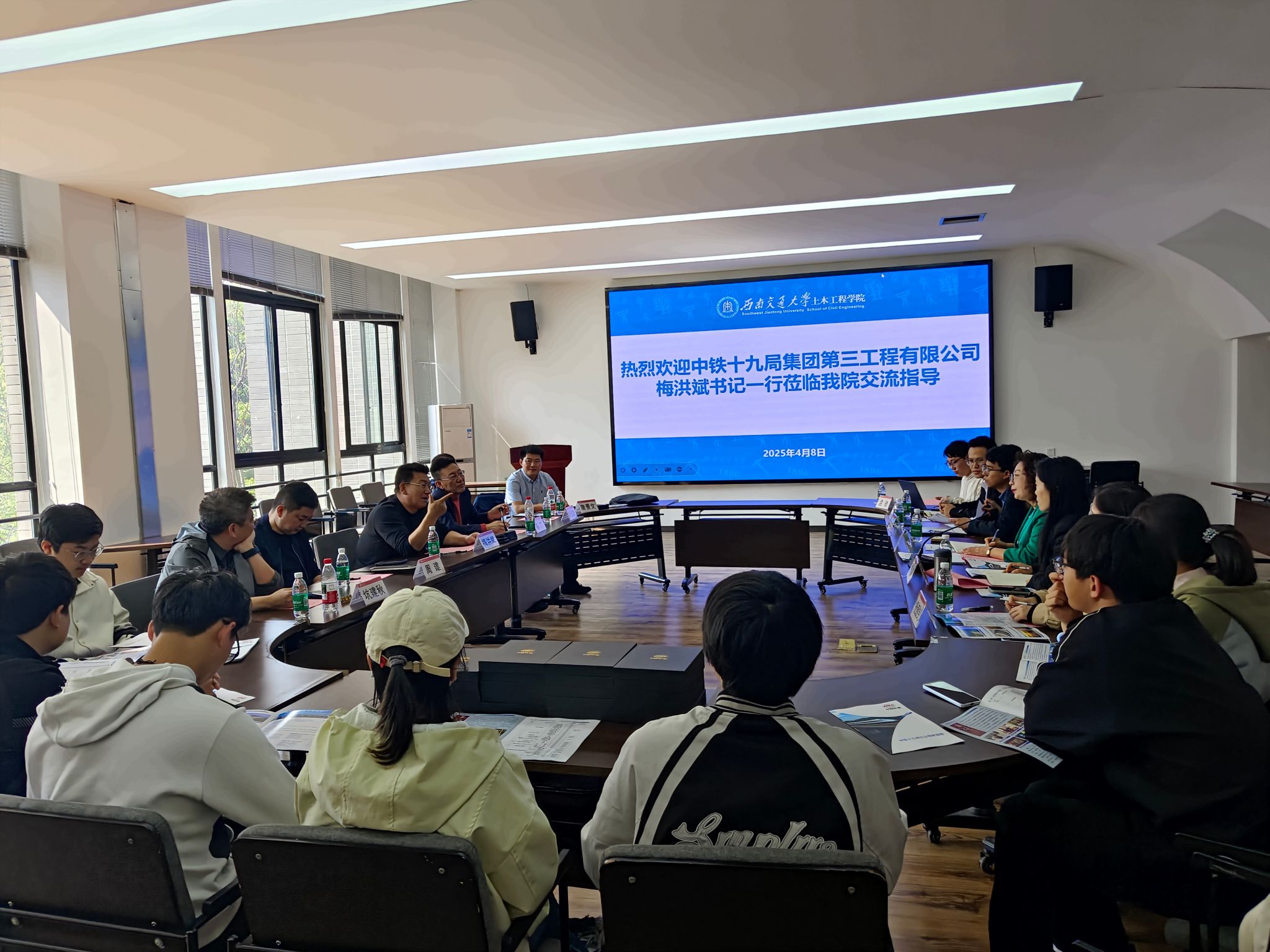 2025年4月8日上午10:30,中铁十九局三公司董事长梅洪斌、纪委书记陈广、第八项管部经理周建、第十项管部经理刘韫鑫、第十一项管部经理坑建秋、党委干部部部长唐景文一行走访bevictor伟德,并于犀浦校区X4407会议室开展校企合作座谈交流,土木工程公司党委书记郑江、党委副书记刘萍、本科生就业专项负责人李江怀、2025届本科生辅导员杨颖钊、彭政涛、2026届本科生辅导员孟迪及15名员工参与此次座谈。
