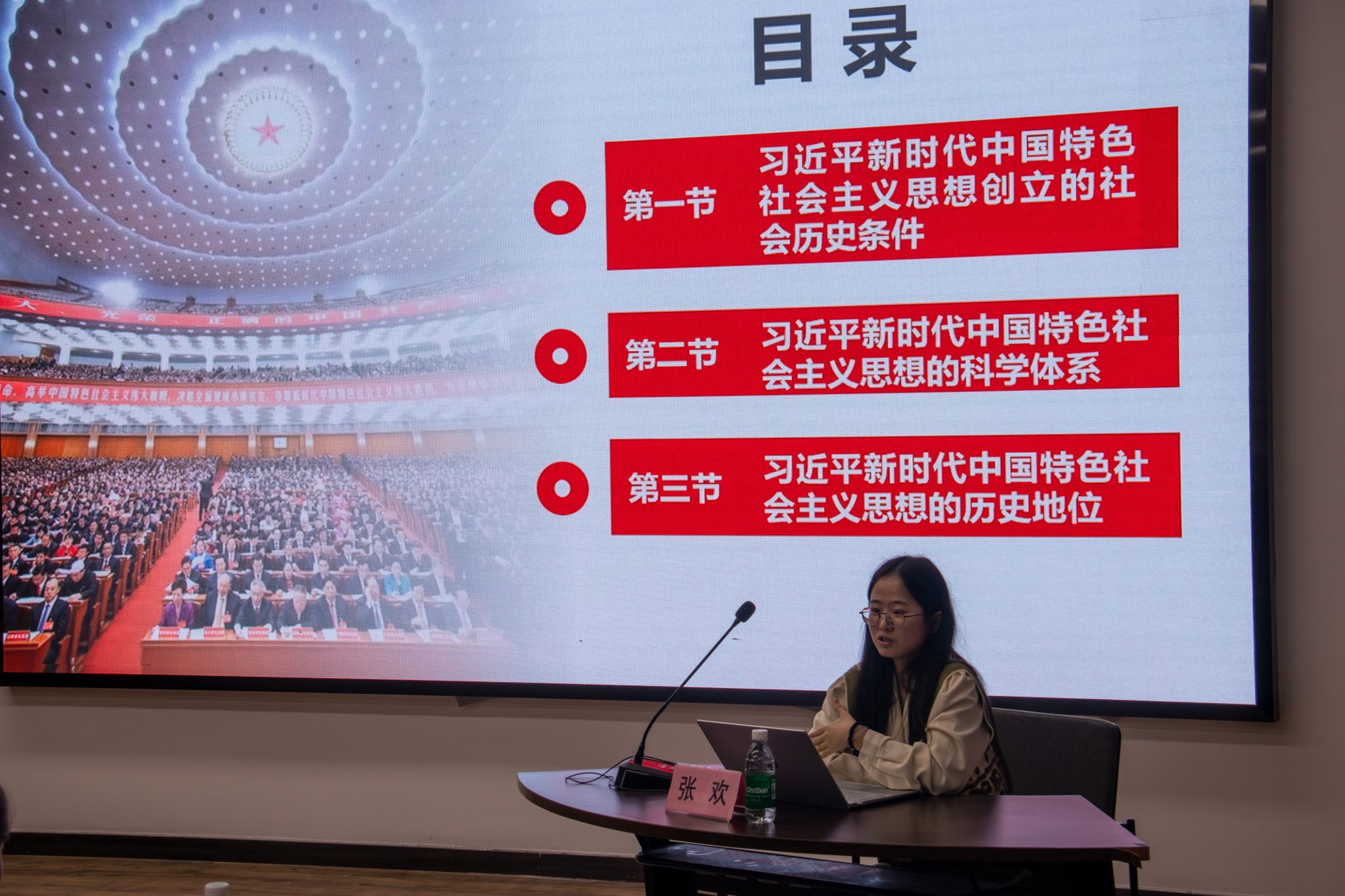 随后,张欢老师着重讲解了“习近平新时代中国特色社会主义思想的核心内容与精神实质”。通过对“十个明确”“十四个坚持”“十三个方面成就”“六个必须坚持”的深入解读,帮助同学们全面理解了该思想的丰富内涵。她还指出,习近平新时代中国特色社会主义思想是当代中国马克思主义、二十一世纪马克思主义,是中华文化和中国精神的时代精华,实现了马克思主义中国化时代化新的飞跃。