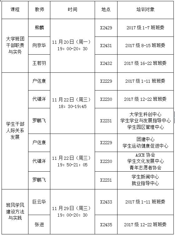 请已报名的班团干部、团学组织干事按照以上课程表准时到达指定教室上课,请一定要携带有效证件(一卡通),将有工作人员现场收取一卡通进行考勤(下课后归还),不得无故缺席。所有参加培训的班干将会组织参加工作研讨会,具体时间地点待定,由工作人员另行通知;请每位参加校园活动策划与开展的组织干事在课程结束一周内上交一份策划,以组织为单位发送至团建中心工作人员邮箱。
