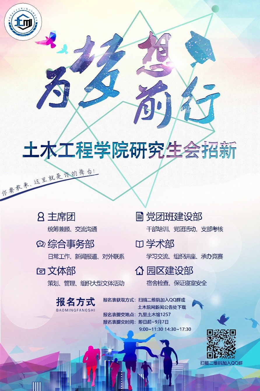 2、纸质报名表提交地点:土木馆1257,时间:9月5日—7日(上午9:00—11:30下午14:30—17:30)。