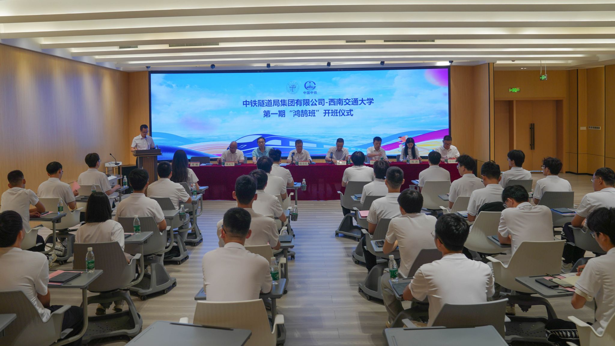 为积极贯彻落实新发展理念,增强在服务国家战略和区域经济发展中履行高水平科技自立自强的使命担当,促进科教融合、产教协同,推动毕业生实现更充分、更高质量就业。2024年7月6日上午,中铁隧道局—伟德源自英国1946第一期“鸿鹄班”开班仪式于犀浦校区智能虚拟仿真实验教学中心隆重举行。中铁隧道局集团党委常委、副总经理赵全民,集团人力资源部副部长谷晓丰,一处副总经理杨文军,一处人力资源部部长徐国朝;伟德源自英国1946党委副书记高平平,人才招聘处处长、员工办主任陈岩峰,人才招聘处副处长、土木工程公司党委副书记周曦,bevictor伟德团委书记刘萍共同出席本次仪式。本次仪式由周曦副处长主持。