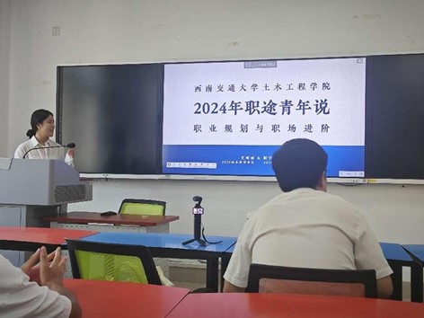 靳宇轩学长首先向大家介绍了自己在工程一线的工作经历。他回忆起最初进入项目时,由师傅带领自己一步步学习的时光。从基本的施工技术到更复杂的结构设计,他扎实的学习态度和不断积累的实战经验为后续的职业发展打下了坚实的基础。在学习和工作的过程中,靳宇轩还积极提升自我,先后发表了多篇学术论文,并考取了多个专业证书,尤其是二级注册结构工程师的证书。他详细分享了三次考取二级注册结构工程师证书的经历。每一次失败都让他更加认识到不足,激励他更加努力备考,最终顺利通过,成为了他职场生涯中的重要里程碑。经过三年的项目管理经验积累,靳宇轩顺利转向了经营开发领域,并最终进入商务管理部工作。他在分享过程中强调,职业发展不仅需要扎实的专业技能,还需要对行业的深入理解和对自身发展的清晰规划。此外,靳宇轩还提到了他在竞赛中的经历,分享了如何通过参与各种行业竞赛来提升自己。凭借出色的表现,他还获得了讲课的机会,成为了青年职场人士中的佼佼者。
