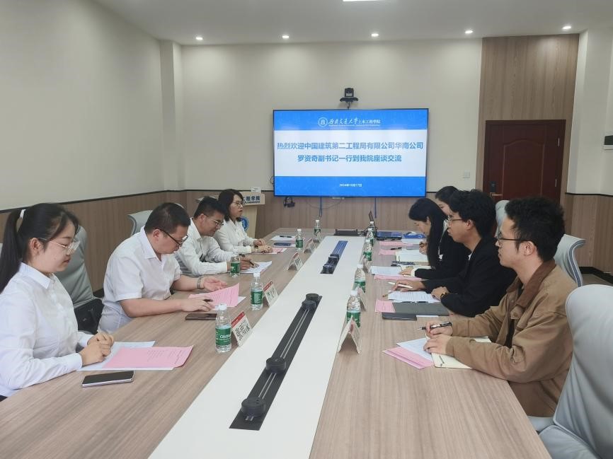 2024年10月18日下午16:00,中建二局华南公司党委副书记、工会主席罗资奇、华南公司人力资源部经理郭建伟、华南公司东莞分公司党总支副书记褚文科、华南公司东莞分公司综合办公室主任王龙、华南公司人力资源部招聘经理张雨濛一行走访bevictor伟德,并于犀浦校区X4417B会议室开展校企合作座谈交流,土木工程公司党委副书记刘萍、辅导员李江怀、杨颖钊、彭政涛、孟迪参与此次座谈。本次会议由李江怀主持。