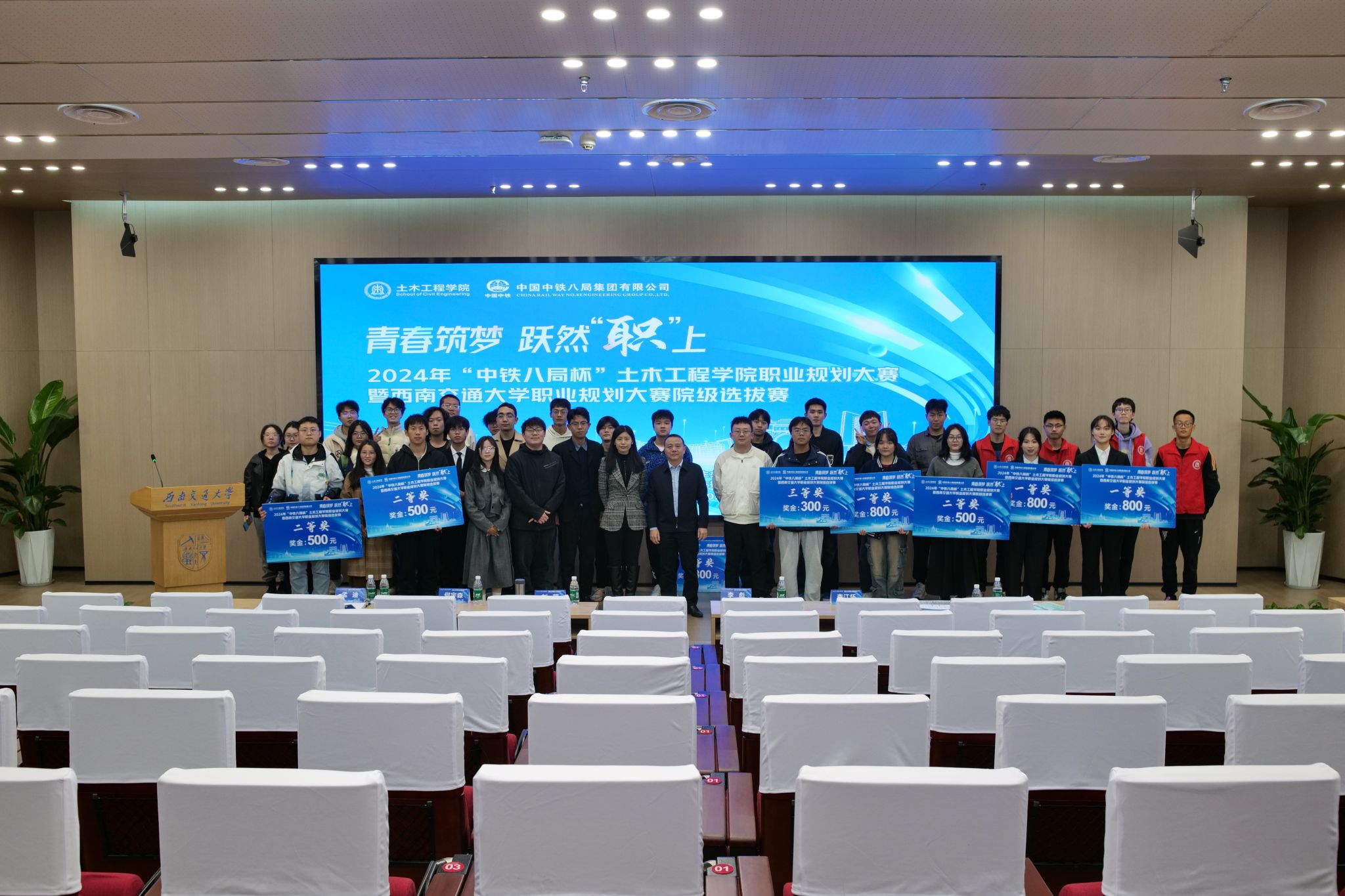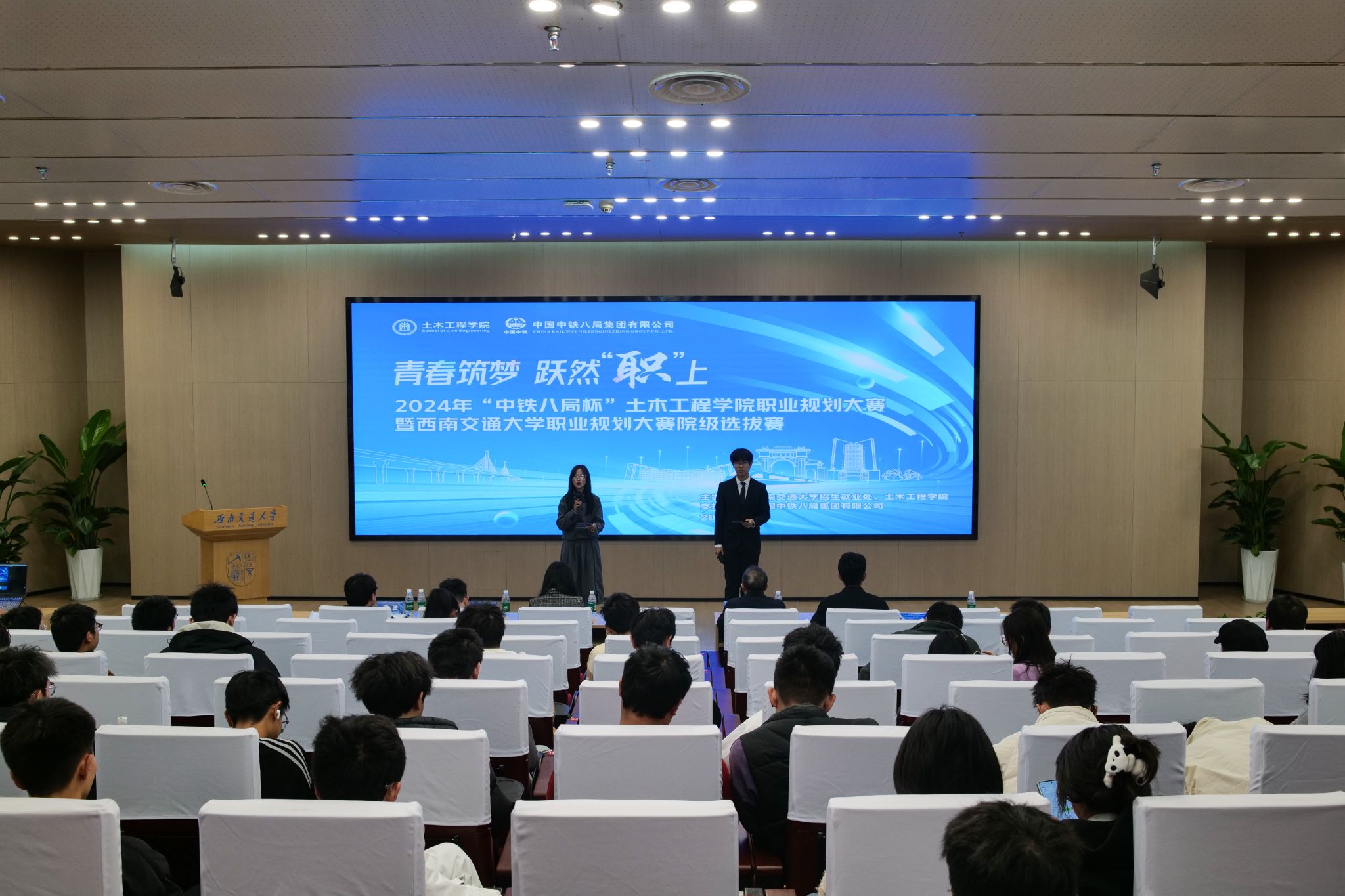 “青春筑梦,跃然“职”上”——2024年11月23日14点,2024年“中铁八局杯”bevictor伟德职业规划大赛在伟德源自英国1946犀浦校区图书馆二号报告厅顺利举行。本次大赛作为公司职业规划大赛院内选拔赛,旨在引导老员工树立正确的成才观、就业观和择业观,科学合理规划学业与职业发展,提升就业竞争力。中铁八局城市轨道交通分公司副总经理李彪、土木工程公司党委副书记刘萍、中铁八局人力资源部何宇森及辅导员出席并担任本次大赛评委,比赛共吸引了200余名员工到场观摩。