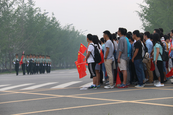 随后,伴着国歌,旗手将五星红旗抛向空中,微红的天空下五星红旗冉冉升起。全场观众庄严肃立,向国旗行注目礼。