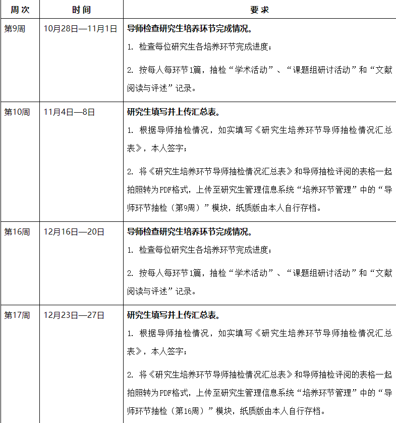 为了做好对公司产品过程管理的质量督导,保障公司产品过程质量,按照《伟德源自英国1946公司产品过程管理与质量督导实施办法 》要求,每学期第 9 周和第 16 周为“导师抽检周”, 每学期第 11 周和第 18 周为“抽检归档周”。本学期抽检对象为2023级和2024级所有研究生(含职工),具体工作安排如下表,请各系室导师按照时间及要求进行培养环节的抽检和归档工作。
