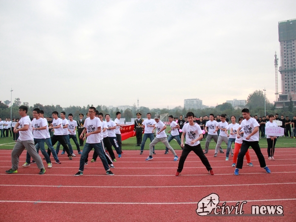 随后,各个班级的开幕式表演便有条不紊地开始进行了。从大一至大二,从茅院土木一班至土木十八班,每个班独具特色的表演都吸引着大家的眼球。“竢实扬华,勇夺桂冠”,嘹亮的班级口号显示出了每位运动健儿力争第一的决心与激情;“友谊第一,比赛第二”,这句耳熟能详的话语展现了竞技比赛中情谊至上的道理。同时,一些班级编排的舞蹈也成为了开幕式上的亮点。比如2015级6班的舞蹈,俏皮有趣,富有活力,赢得了在座领导、嘉宾和在场同学的热烈掌声。而2014级15班的武术表演也毫不逊色,行列间整齐划一的动作,铿锵有力的出拳,也得到了大家的赞许。