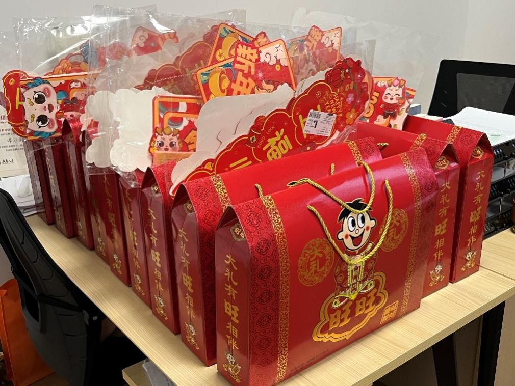 今年,公司为每一位留校员工精心准备了“红小土陪你过大年”新春慰问大礼包,此外,还准备了营造节日氛围的“福”字、春联、红小土玩偶等小礼品。