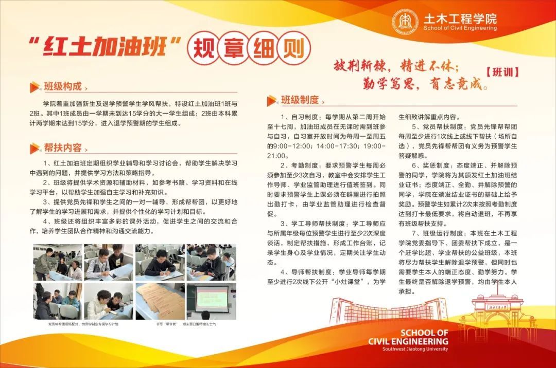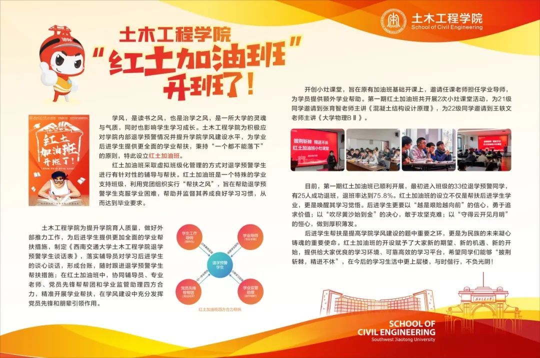 在一系列帮扶措施下,第一期红土加油班已于上学期顺利开展,最初进入班级的33位退学预警同学,有25人成功退班,退班率达到75.8%!红土加油班的 设立,不仅是帮扶后进员工解决学业困难,更是以唤醒学习觉悟与深挖学习动力为目的。总结第一期加油班中存在的优点与不足,汲取经验,优化细节,第二期红土加油班全新升级,强势归来!