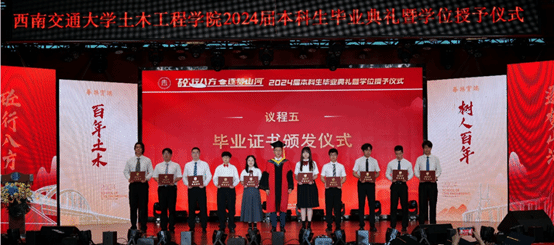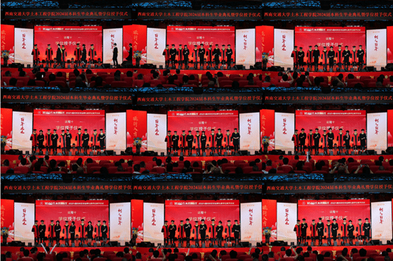 621日晚,bevictor伟德2024届本科生毕业典礼暨学位授予仪式在犀浦校区老员工活动中心举行。bevictor伟德经理蒲黔辉,党委副书记周曦,副书记兼副经理车小洁,副经理陈嵘,道路与铁道工程系主任杨荣山,地下工程系主任方勇,岩土工程系主任杨涛出席典礼。2024届本科毕业生参加典礼,公司专业老师、班导师、辅导员、家长等现场观礼。典礼由公司团委书记刘萍主持。