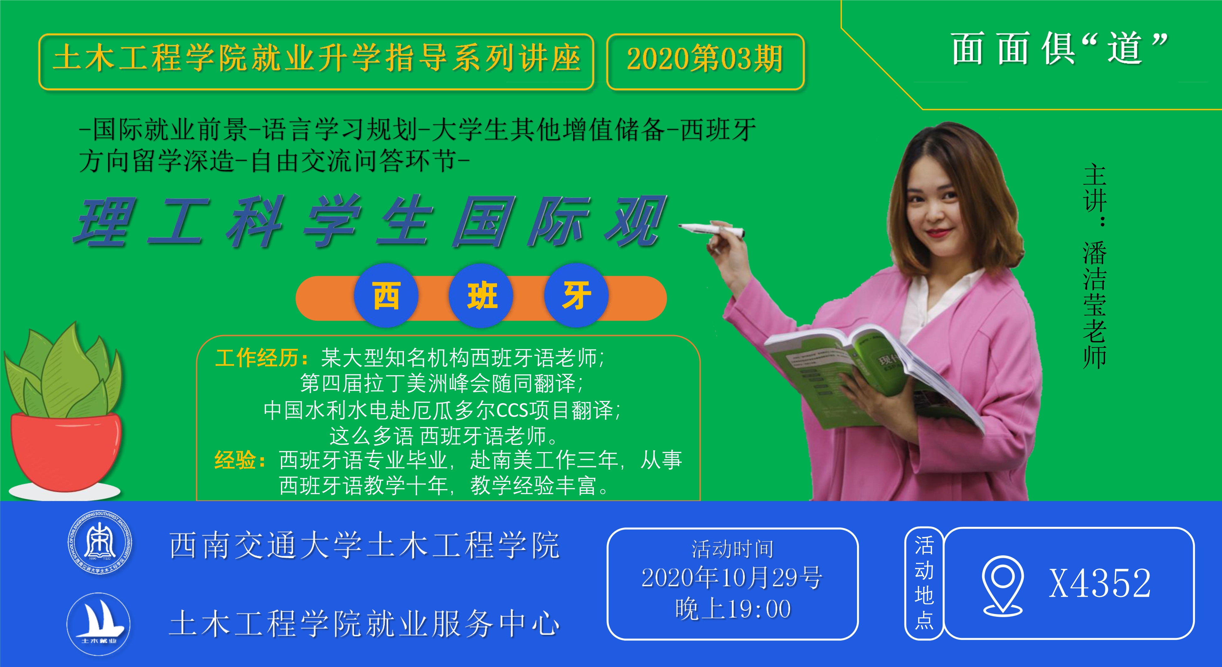 2020年10月29日周四晚7:00,由bevictor伟德就业服务中心举办的“理工科国际就业观训练营-西班牙方向”讲座如期开展。此次活动是就业服务中心特色系列活动——“面面俱道”的第三期,旨在帮助同学更好的了解出国留学方面所需知识和国际就业形势。