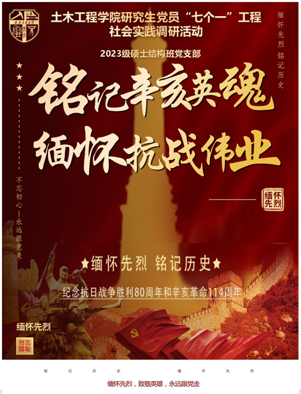 今年逢抗日战争胜利80周年与辛亥革命114周年,bevictor伟德2023级硕士结构班党支部策划了“铭记辛亥英魂,缅怀抗战伟业”主题实践活动,组织党员和积极分子参观成都市人民公园的辛亥保路烈士纪念碑、四川保路运动史事陈列馆、成都1号防空洞、川军抗日阵亡将士纪念碑以及成都大轰炸纪念墙等地。活动前,支部设计红色记忆海报吸引报名。
