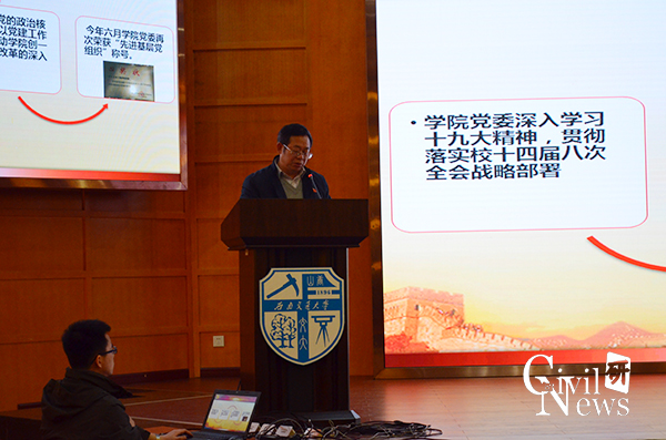 首先,刘学毅书记做了以学习贯彻十九大精神、对标“双一流”建设目标以及以党建一流推动公司改革发展为主题的2017年土木工程公司党建工作总结。他说,为了切实加强高校思想政治工作,巩固意识形态阵地,公司基层党组织一年来做了许多实质性工作并取得了丰硕的成果。在十九大精神引领下推进“两学一做”常态化制度化,规范做好基层党建的日常工作。同时,刘书记也分析了当前党委工作开展中存在的不足和问题,提出了未来工作努力方向。