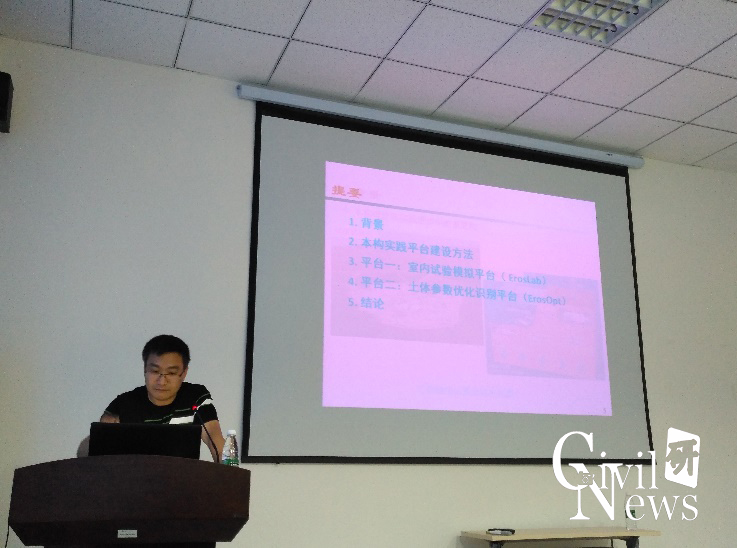 尹教授以“土的本构模拟及参数识别实践平台开发”为题向大家介绍了一个非常高效实用的土工计算软件平台。该软件平台包括Eroslab室内试验模拟平台和ErosOpt土体参数优化识别平台,由尹教授及其员工金银富博士自主开发设计。它的主要界面由微软的Visual C完成,后台计算程序使用FORTRAN语言编译,主要负责计算任务和模拟分析;后处理界面则由MATLAB完成,负责处理计算结果、绘制计算曲线结果图。整个平台包含丰富的本构模型、多样的加载控制模式和完备的本构模型调试功能,尹教授也现场演示了部分实际操作步骤,十分强大高效。