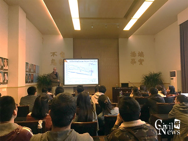 Patrick Phelan教授在本次讲座中分享了未来建筑在零净能源和碳中和下的发展前瞻。他首先介绍了亚利桑那州的情况以及建筑能耗的现状。然后介绍了不同能源用于建筑中的消耗情况以及造成的费用情况。接着介绍了未来建筑考虑的一些方面,如:对人体健康的影响,对环境的友好程度等。Patrick Phelan教授讲到“绿色”建筑的发展一般是向零净能源发展,并且在一些地方发生得非常迅速。例如,加利福尼亚州已经要求到2020年所有新建住宅建筑物的零净能源。另一个更加困难的挑战是碳中和建筑。美国能源部建筑技术办公室与太平洋西北国家实验室合作,组织了为期一年的努力,题为“未来建筑”,目标是解决这个困难。这项研究涉及跨学科的顾问小组和专家参与了一系列涉及建筑技术,材料,建筑,施工实践,健康,城市规划和环境科学的网络研讨会,研讨会,研讨会和会议介绍从现在开始大约一百年以后,对建筑物的一致看法。教授在报告中分享了许多数据图表,语言幽默风趣,讲解通俗易懂,在场的老师与员工都表现出了浓厚的兴趣。