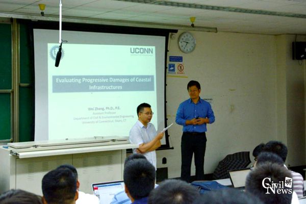 应桥梁工程系李永乐教授、汪斌副教授邀请,美国康涅狄格大学张伟博士于8月21日—8月23日访问公司。8月21日上午,张伟博士在九里校区逸夫馆4209教室带来了一场题为“Evaluating Progressive Damages of Coastal Infrastructures”的精彩学术报告会。公司桥梁工程系主任李永乐教授、副主任张清华教授、郑史雄教授、晋智斌副教授、魏凯副教授、姚昌荣老师、王骑老师、张明金老师及三十余名博士、硕士研究生聆听了报告,参与交流。