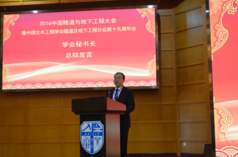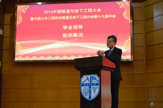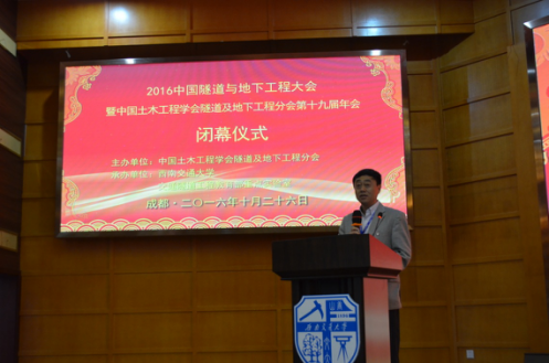 闭幕式最后,大会副理事长何川教授为此次的隧道年会致闭幕辞。何教授首先向志愿者以及以谭忠盛、仇文革、黄明利等人为代表的会前培训专家们为此次大会的付出致谢。随后,何教授指出此次的大会是一个高起点,大平台的会议,大会围绕现阶段隧道施工重难点,提出了新理论、新方法、新技术与新工艺,将隧道的发展又推向了一个新的台阶。