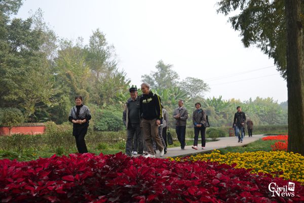 上午9时许,63位离退休教师先后从九里、犀浦校区出发,分乘两辆大巴,在土木工程公司党委副书记李彤梅的带领下,驱车2小时到达青城山鹤翔山庄。天气虽然略带寒意,但大家满怀憧憬,带着爽朗的心情,一路上充满了欢声笑语。
