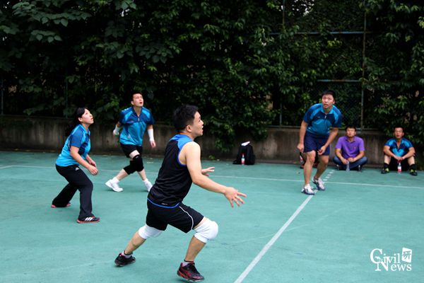 双方经过简单休息,易边再战,开始第二场的较量。第二场比赛,土木队率先发力,加强了本队的防守力度。机关队愈战愈强,主攻手接连扣球、吊网使我队处于被动状态。但土木队也不甘示弱,奋力追击,将比分拉到11:15。比赛进入白热化阶段,土木队不气不馁,依旧坚守赛场,最终还是以15:25输掉比赛。