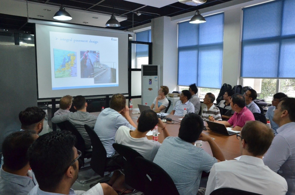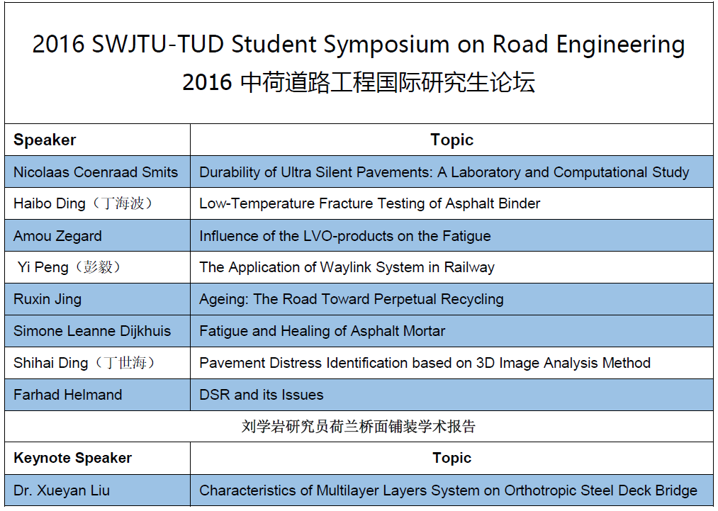 4日上午,中荷道路工程研究生国际学术研讨会在bevictor伟德1400会议室举办。TU Delft师生代表团,公司道路与铁道工程系陆阳教授、艾长发副教授、阳恩慧老师、任东亚老师及研究生参加了本次研讨会。受邱延峻教授委托,艾长发副教授首先热烈欢迎TU Delft师生代表团,介绍公司基本情况,并特别介绍了公司道路工程学科团队概况与主要研究方向。随后Xueyan Liu 研究员从国际学术声誉、校园环境、院系组成、师生概况等方面介绍了荷兰代尔夫特理工大学,并概要地介绍TU Delft路面工程系在沥青混合料微观到宏观力学建模的最新研究成果。随后任东亚老师主持了中荷道路工程研究生国际学术研讨会,来自TU Delft路面工程系的5位博士研究生,与公司的3名博士研究生分别用英语汇报了其课题研究思路与现阶段所取得的学习成果,并同在场师生进行热烈的学术讨论。最后,Xueyan Liu 研究员作了题为“Characteristics of Multilayer Layers System on Orthotropic Steel Deck Bridges”的学术报告,系统的介绍了TU Delft在沥青混凝土桥面铺装先进测试与表征方法的研究成果。精彩纷呈的学术报告和热烈的讨论互动为公司广大师生开拓了研究视野,提高了新的研究思路,促进了学术成果的交流。