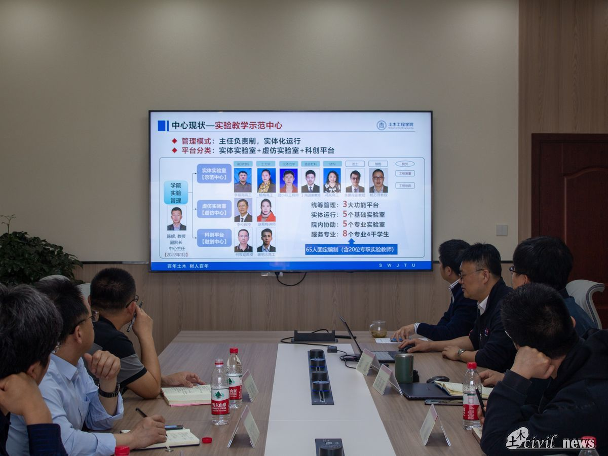 活动伊始,聊城大学建筑工程公司经理孟昭博、实验室主任王英来与刘名名老师在土木工程国家级实验教学示范中心副主任李福海的带领下参观了土木工程国家级实验教学示范中心。土木工程国家级实验教学示范中心是一个集教学、科研和实践于一体的综合性实验平台,拥有先进的设备和完善的功能,提供了一个全面、实践性的教学环境。聊城大学老师们对示范中心的设施和管理模式赞不绝口,并对其取得的教学成果表示钦佩。