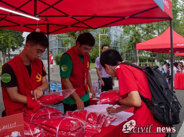晨光熹微之时,一群红色的身影已经在公司迎新点位上忙碌着。新生物资清点摆放,件件明晰;报到流程熟悉掌握,样样落实。志愿者和党员服务队的同学们各自分工,在迎新点位严阵以待,在辅导员的引导下有条不紊地进行新生身份核验、物资发放等工作。