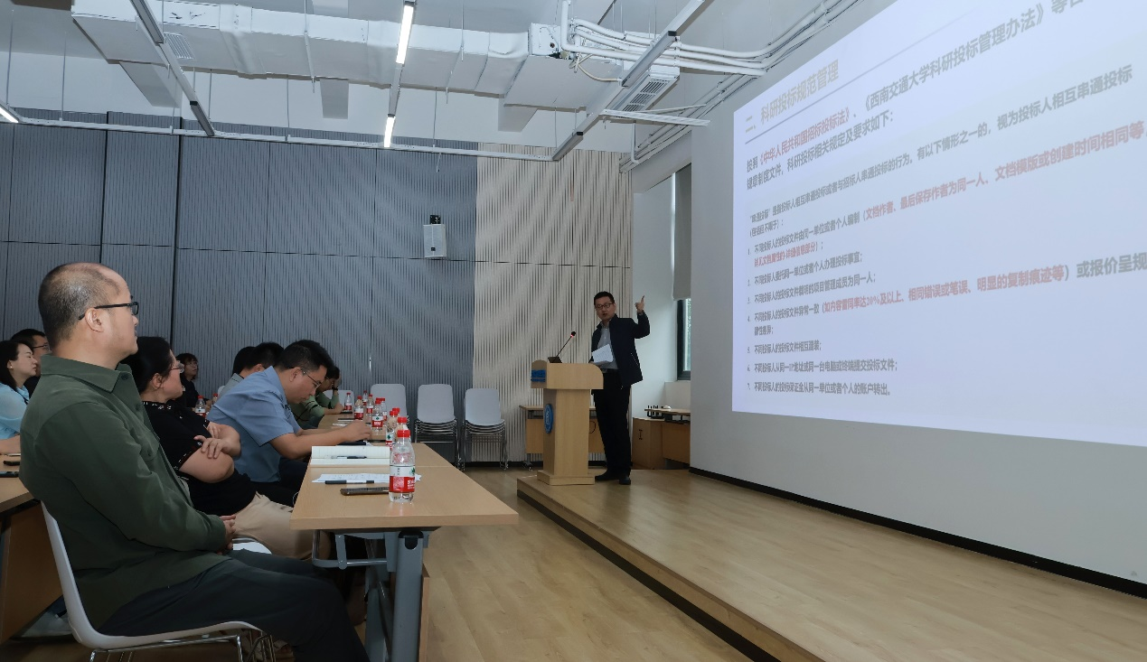 随后,公司科学技术发展研究院李怀龙副经理进行了《科研投标规范管理》专题宣讲。李经理首先提出加强科研诚信建设、科研经费管理和主动监管的重要性,强调广大教师一定要严格遵守国家和公司的规章制度,合理合法合规地开展科研活动,注重科研诚信。同时,详细介绍了科研投标规范管理,指出现阶段科研投标信息化建设正逐步完善,公司教学科研人员应强化责任意识,严格遵守各项规定,规范投标行为。