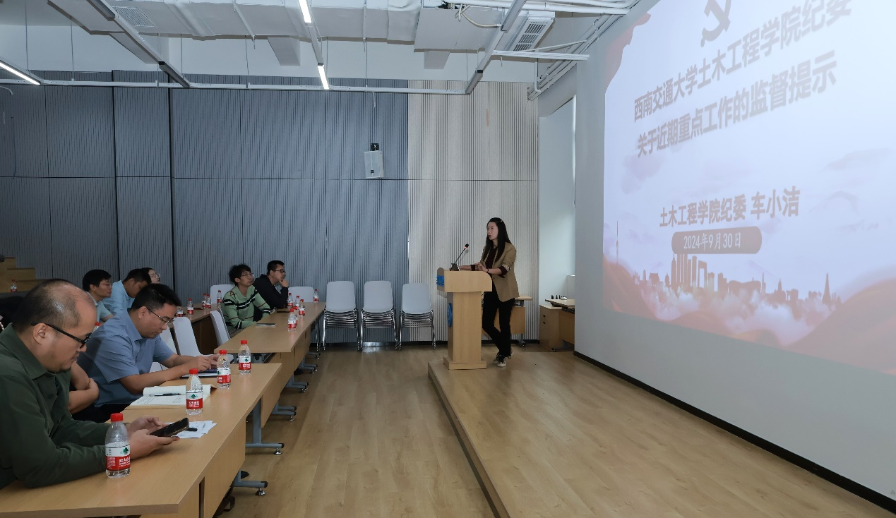 最后,土木工程公司党委副书记兼纪委书记车小洁同志对公司党委和纪委的近期重点工作进行了提示。车书记从师德师风建设和纪律工作两个方面强调了教师工作的重要性,表示各个教工党支部要做好党纪学习教育总结、认真学习贯彻党的二十届三中全会精神。她还充分传达了“纠'四风'树新风”的专题精神,指出各系室要加强2025年推免工作中的纪律要求,同时要进一步规范公司仪器设备资产的使用管理。