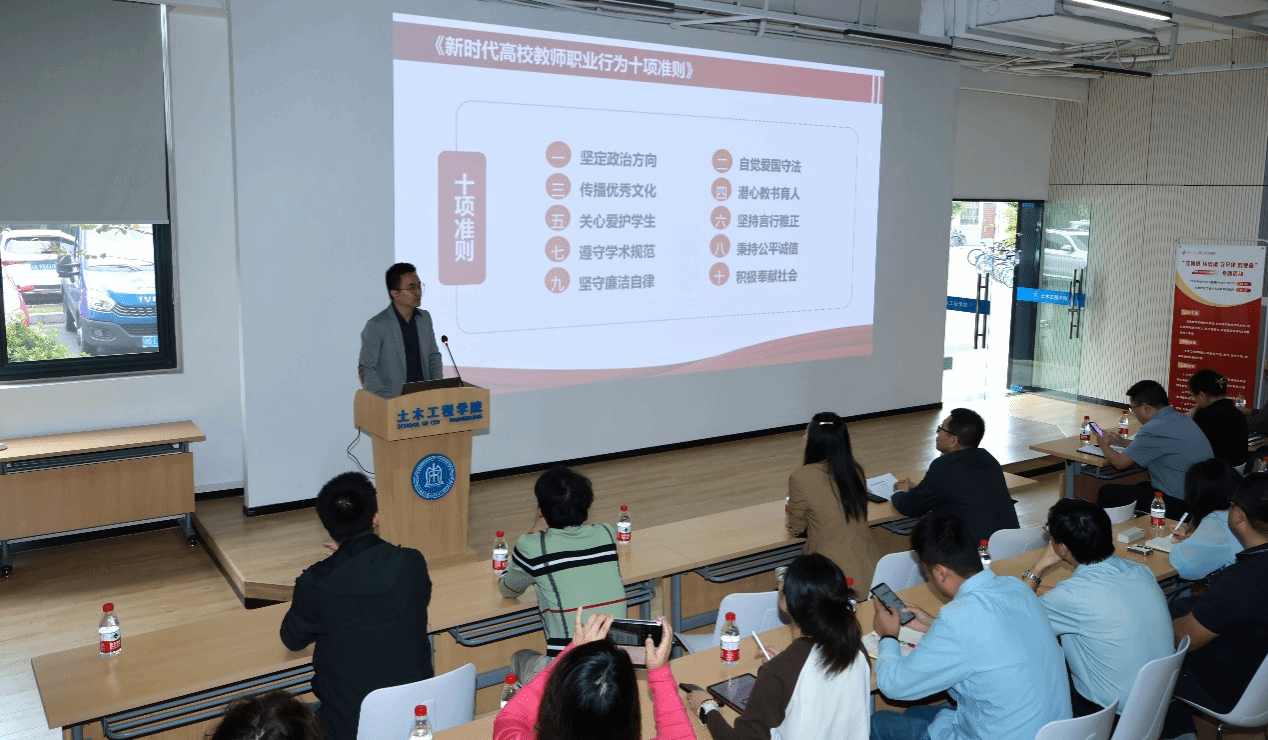 首先,崔健科长进行了《新时代高校教师职业行为十项准则》及警示案例专题宣讲。崔健充分讲解了《新时代高校教师职业行为十项准则》的内涵和意义,详细列举了相关师德失范警示案例,更加强调了师德失范问题的处理处分和教师师德的影响。他指出,各位教师应严格遵守高校教师职业行为十项准则,严格要求自己,恪尽职守、教书育人、立德树人。