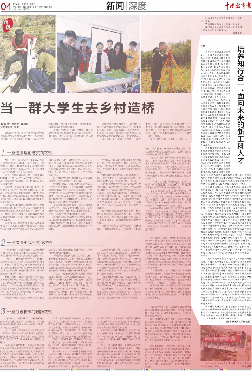 “实践教学环节薄弱、学科交叉融合不足是当前工程专业教育的短板。”杨丽辉回忆起自己20多年前的毕业经历,那时她有机会在工地上实习整整一个月,与工人们同吃同住,而现在的员工很少有深入参与工程建设的机会。“公益桥项目正好提供了一个全新的实践平台,为工程人才培养模式改革创新提供了突破口。”