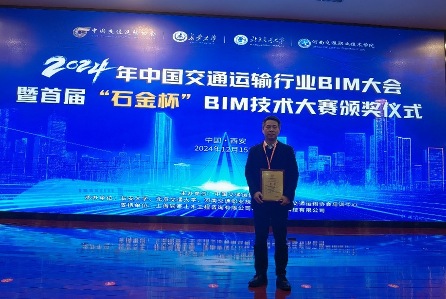 时至岁末,喜讯频传。2024年12月15日,中国交通运输协会主办的首届“石金杯”BIM技术大赛颁奖仪式在西安举办,公司图学及BIM研究所尹紫红副教授主持申报的《成都地铁17号线穿河半盖挖车站深基坑工程中BIM+技术的智能化集成应用》荣获高校组金奖。
