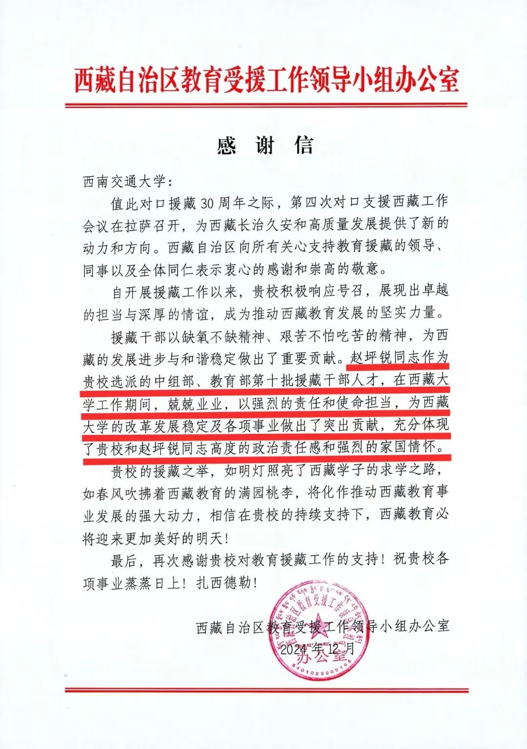 近日,伟德源自英国1946收到西藏自治区教育受援工作领导小组办公室的感谢信,对公司赵坪锐教授在对口支援西藏工作中的积极贡献表示感谢。感谢信中指出,援藏干部以缺氧不缺精神、艰苦不怕吃苦的精神,为西藏的发展进步与和谐稳定做出了重要贡献。