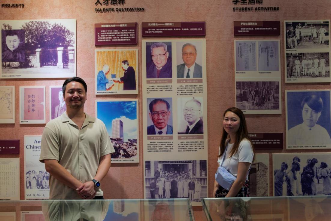 随后,夫妇二人来到校史馆。在关于公司“黄金时代(1920-1937)”的展陈中,林同炎先生的事迹被重点呈现。讲解员详细介绍了林同炎先生1931年从唐山交通大学(西南交大前身)毕业后,在工程领域取得的开创性成就:1967年凭借卓越的学术造诣当选美国国家工程院首位亚裔院士;1986年里根总统亲自为其颁发美国国家科学奖章——这是美国科学界的最高荣誉。一张张珍贵的照片,一段段详实的文字,串联起林同炎先生将交大精神远播海外、造福世界的辉煌历程。