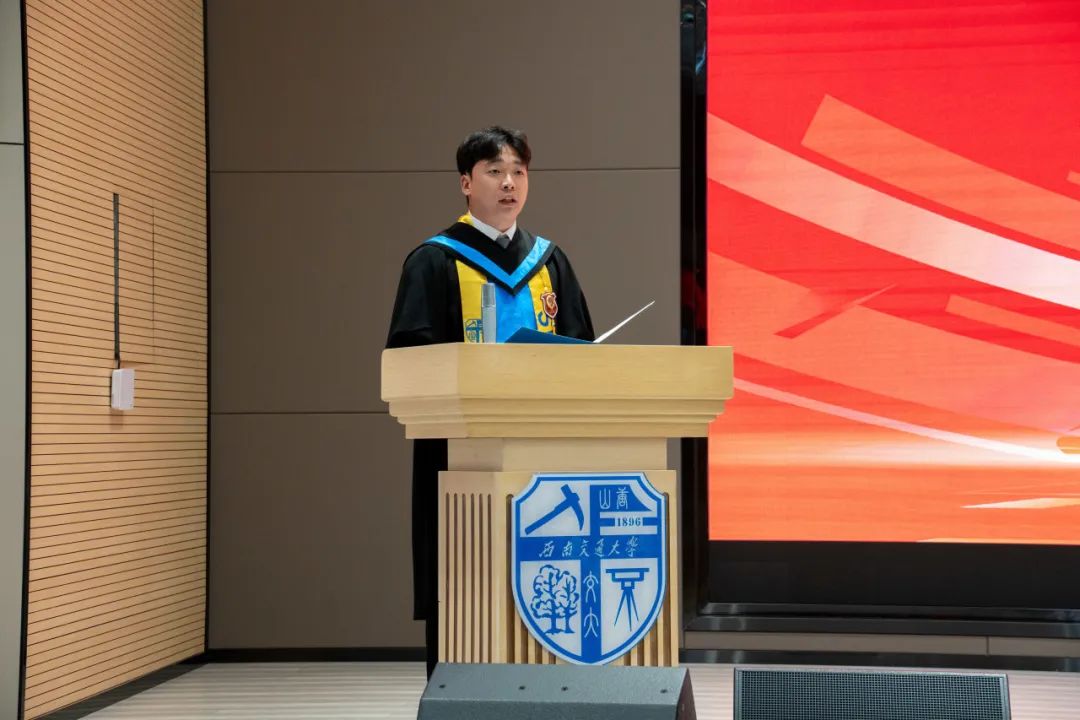 本科毕业生代表宋雨宸同学回顾四年求学路,在专业学习、竞赛实践与员工工作中完成从青涩到成熟的蜕变成长,并对母校、师长、家人和同窗表达了诚挚的感谢以及衷心的祝愿。
