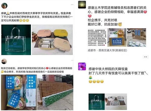 与此同时,中铁大桥院全体员工情系蓉城、心系学子,为公司全体硕博研究生捐赠2650个保鲜饭盒,积极助力公司疫情防控工作,员工们纷纷表示“母校是永远的家,作为交大土木人,员工们时刻不忘母校的培养之恩,通过捐赠物资支持母校工作,希望与全体师生同心戮力,共克时艰。”