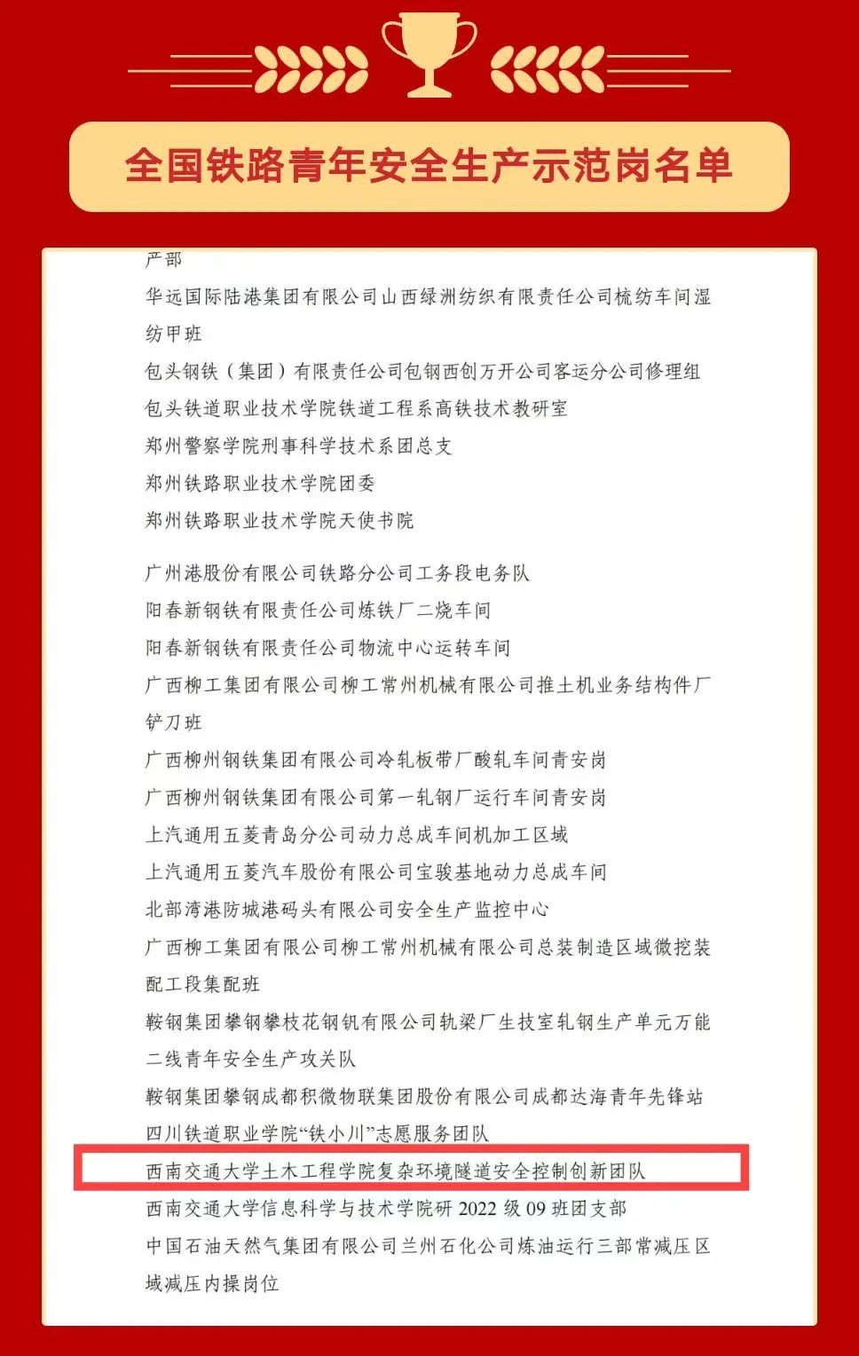 为树立典型,激励奋进,进一步促进青年成长成才,经全国铁道团委评审决定,bevictor伟德复杂环境隧道安全控制创新团队荣获“全国铁路青年安全生产示范岗”。