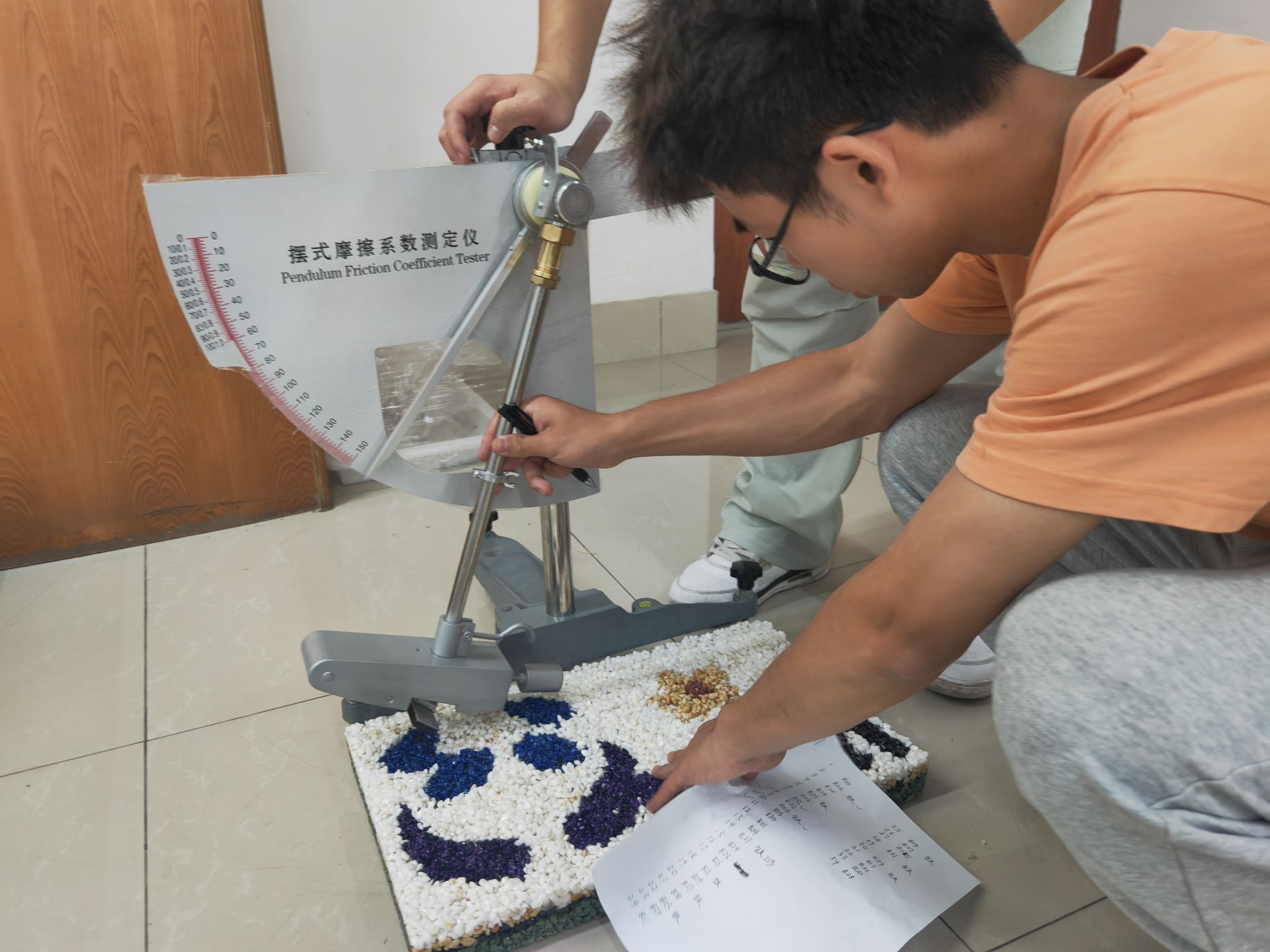 答辩结束后,比赛进入实际加载环节,各小组带上自己的模型,分别进行透水性、抗剥落性以及抗滑性测试,并由科创中心相关的负责人员对透水程度、设备转动角度、进行记录,以此对模型的各项性质做出判断。